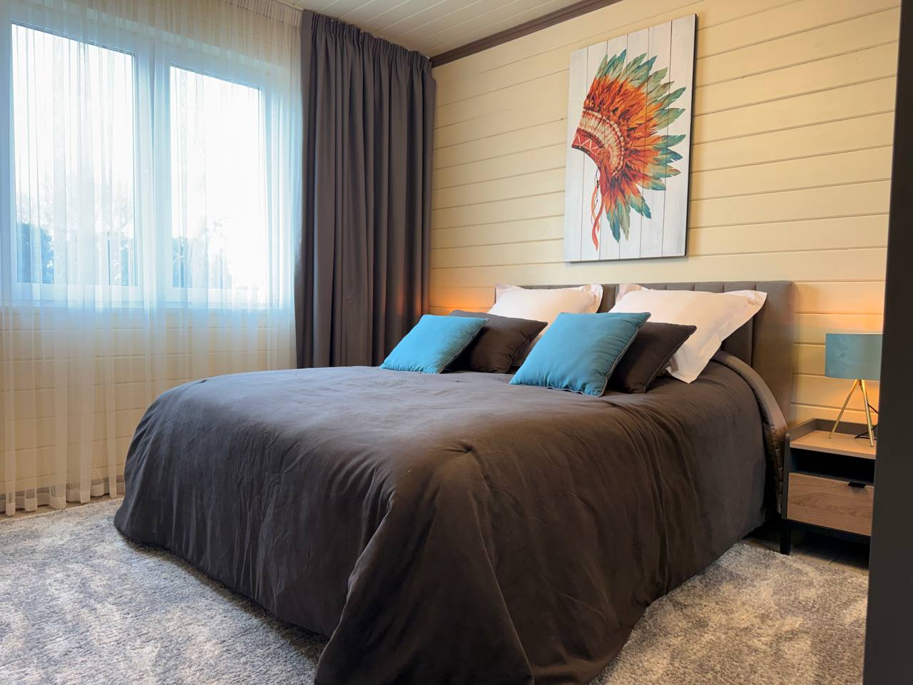 - Дом, площадью 149м2, включает в себя: кухню с обеденной зоной, гостиную с камином, три спальни, санузел, ванная, прихожая, постирочную комната, терраса. Здесь с комфортом могут разместиться до 6 человек.